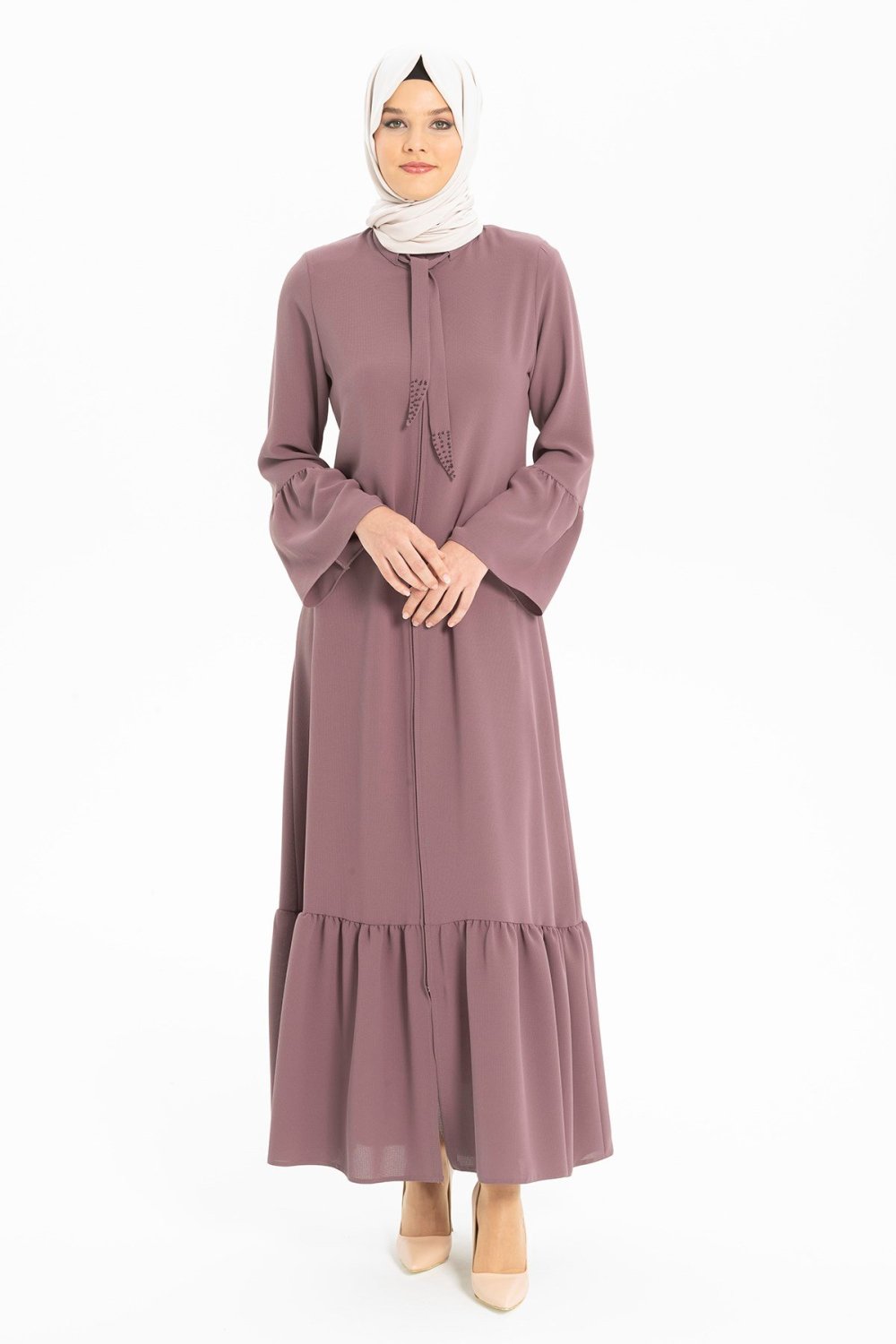 Beyza Cevher Yakası Bağcıklı Taş İşlemeli Ferace Gül Kurusu