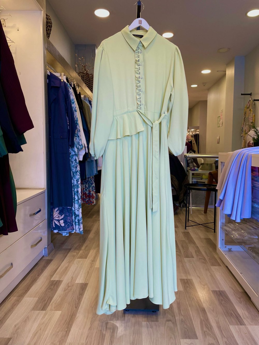 Ceremony Önden Patı Fırfırlı Belden Kuşaklı Kloş Vien Elbise Fıstık Yeşili