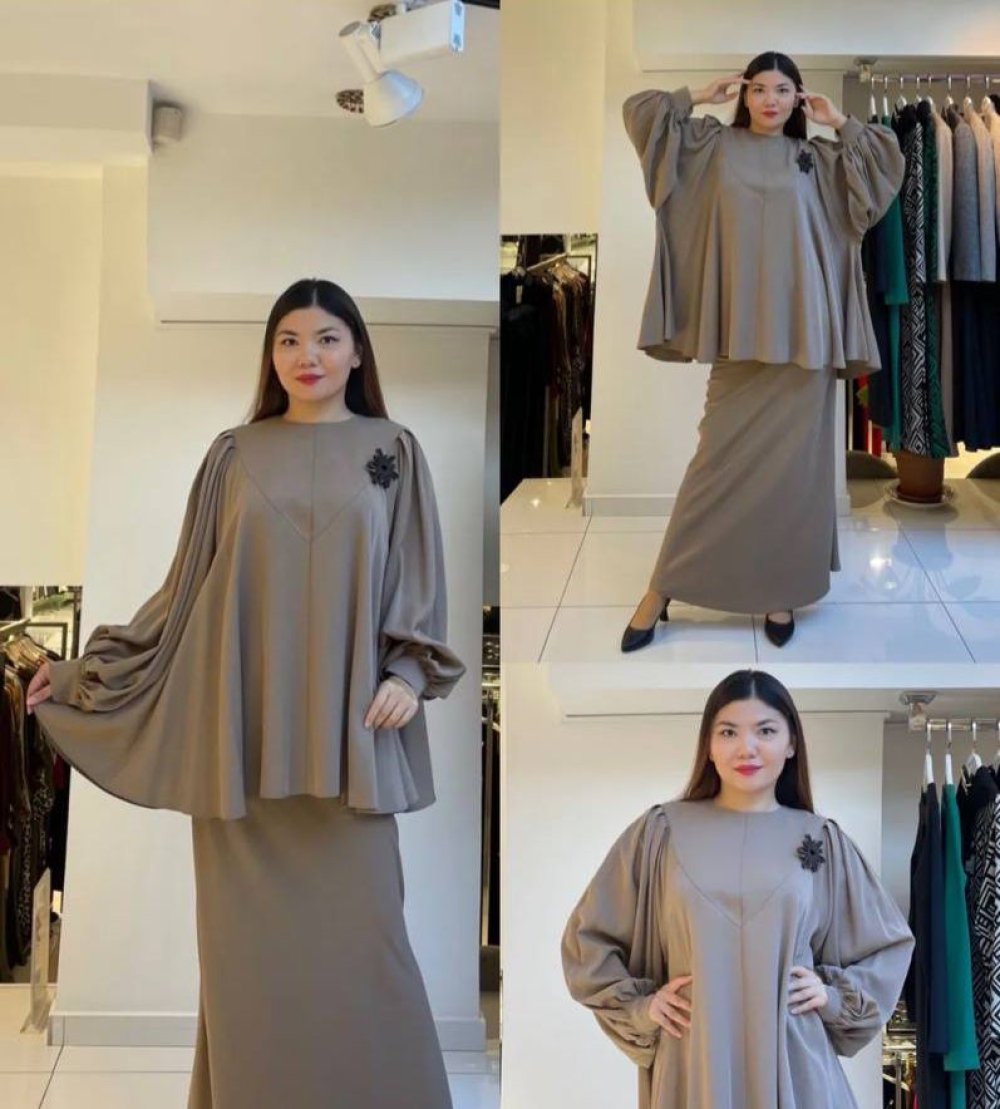 Ceremony Tuniğinin Kolları Balon Verev Tencel Etekli Takım Vizon
