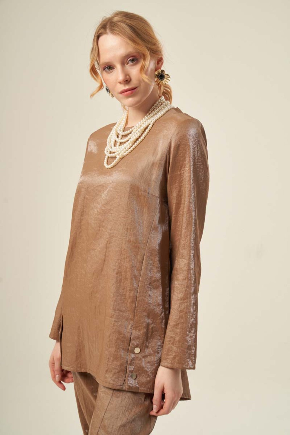 Ürün Bilgisi, Çıtçıt detaylı, bisiklet yaka, koyu bej renk tunik.