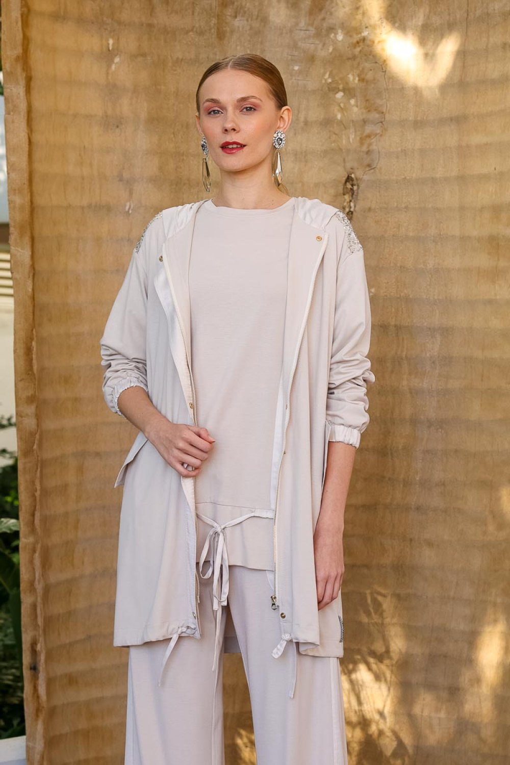 rün Bilgisi, omuz kısmı ve kapüşonu payet detaylı, fermuarlı, çıt çıt detaylı, etek ucu büzgülü, kolları lastikli, kapüşonlu, taş renk ceket.